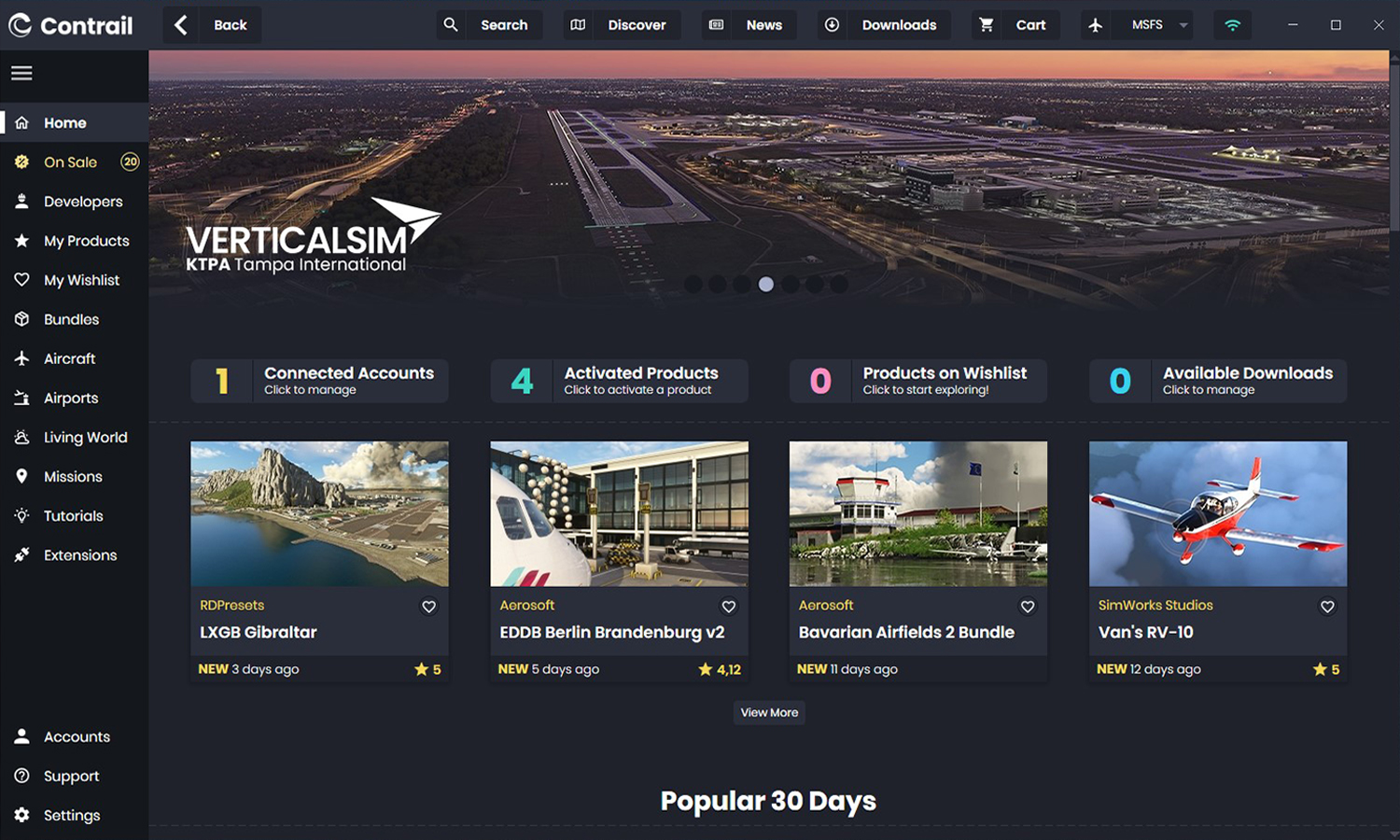 Contrail is the ultimate solution for flight simulation enthusiasts who want to streamline their purchasing and installation process. With Contrail, you can connect multiple webshops and purchase your favourite scenery addons from your preferred developers, all in one place.
