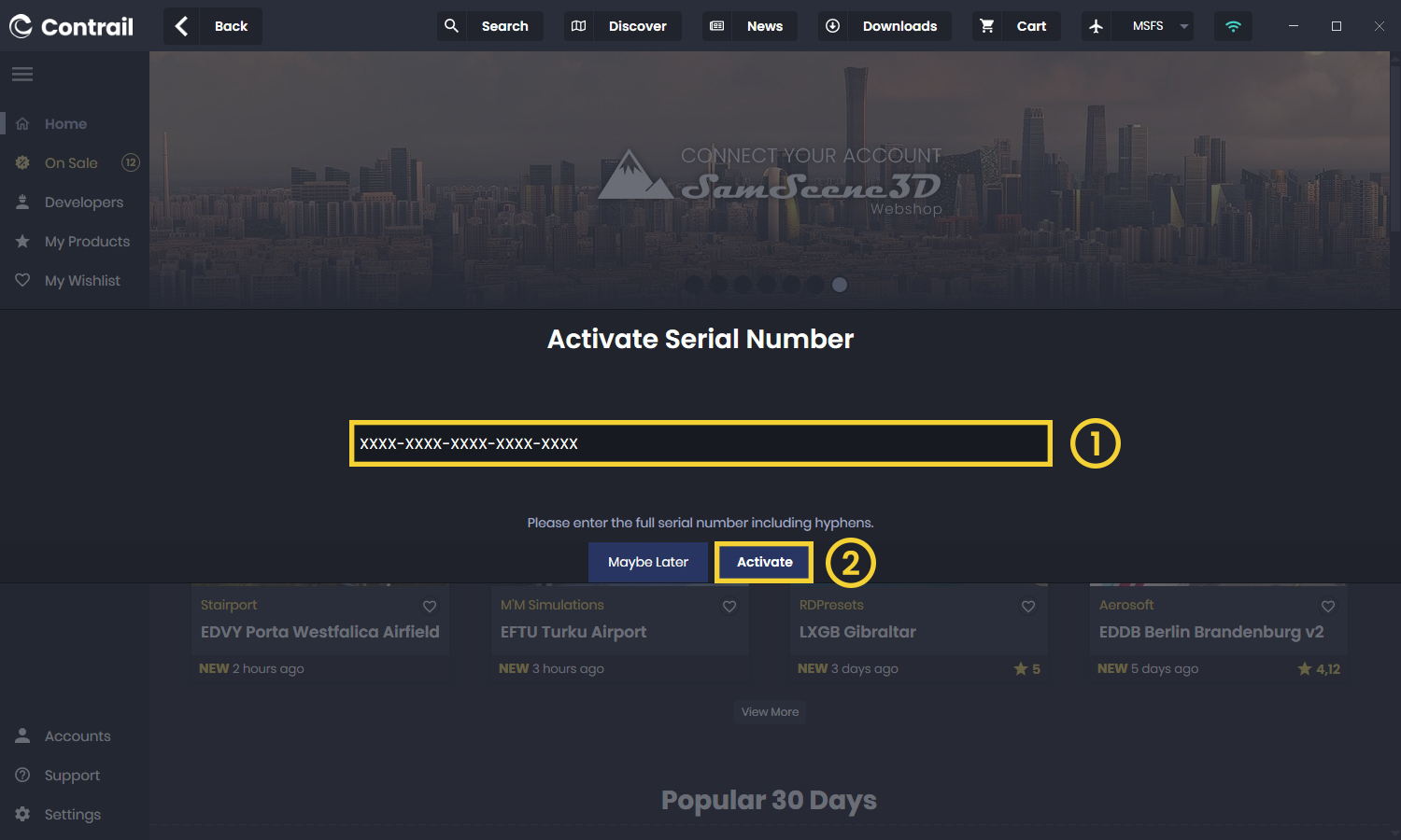 On the next screen, enter the 24-character serial number and confirm the activation by clicking on Activate. If the serial number is valid, your product will now be part of your library and ready for download.