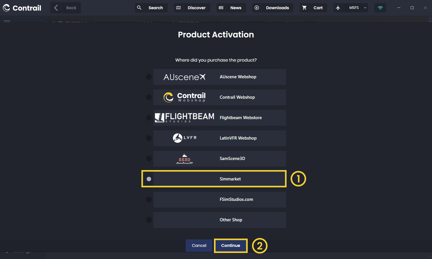 Next, select the vendor you purchased the product from. In this example, we will choose Simmarket. Then, click Continue