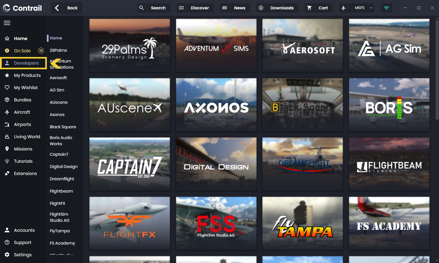 Browse products by a specific developer by clicking on the Developers tab in the left-hand list. The Home tab displays an overview of all developers currently offering their products on the Contrail Webshop. Clicking on a developer individually will display all of their released products.