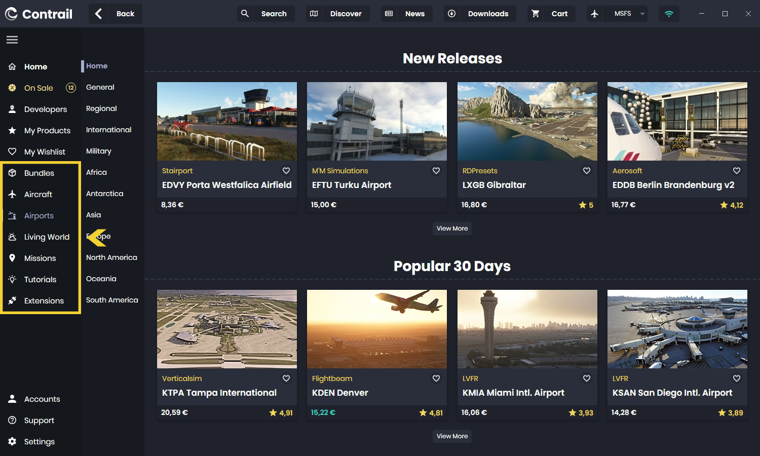 Browse products by category, such as Aircraft or Airports, by selecting the category in the left-hand list. The subcategories offer more specific filter options. For example, you can filter by Regional or International
