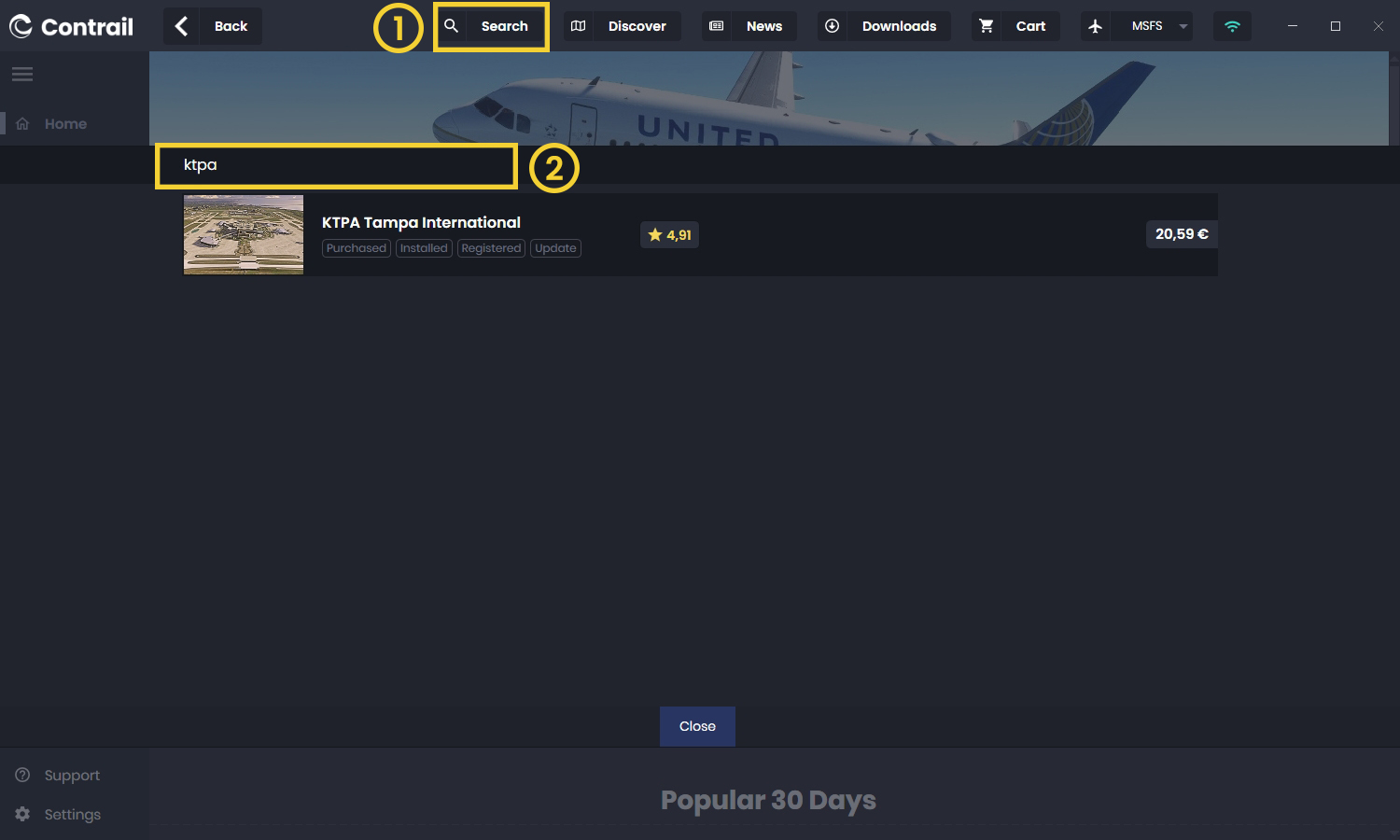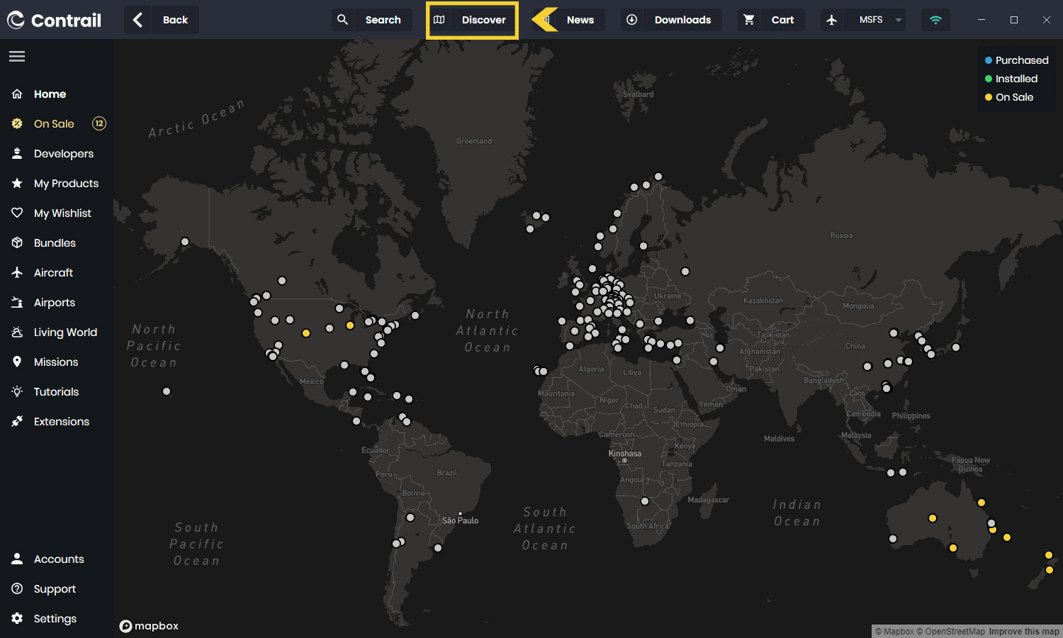 Explore the world map by clicking on Discover in the top bar of the app. The map displays marked locations for all available airports, making it easy to navigate and explore new destinations.