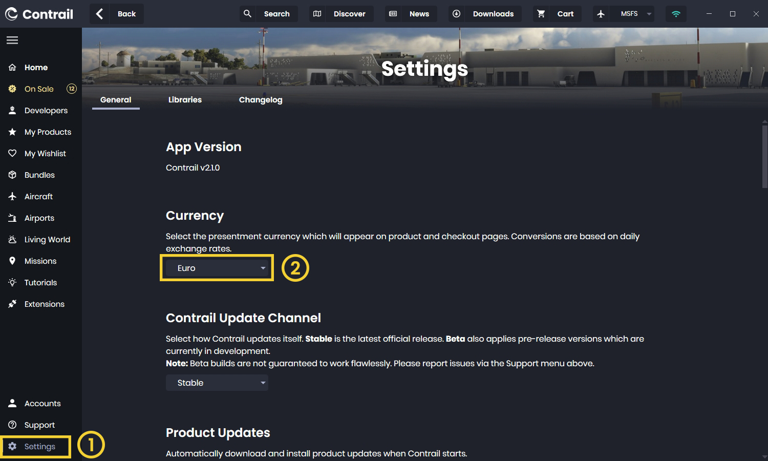 Every shop has a base currency, which is used to set the product prices. The base currency for the Contrail Shop is Euros (EUR). Other shops, such as Flightbeam, may have a different base currency, such as US Dollars (USD).