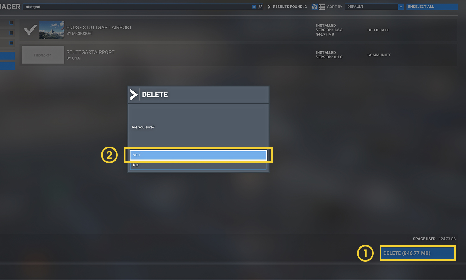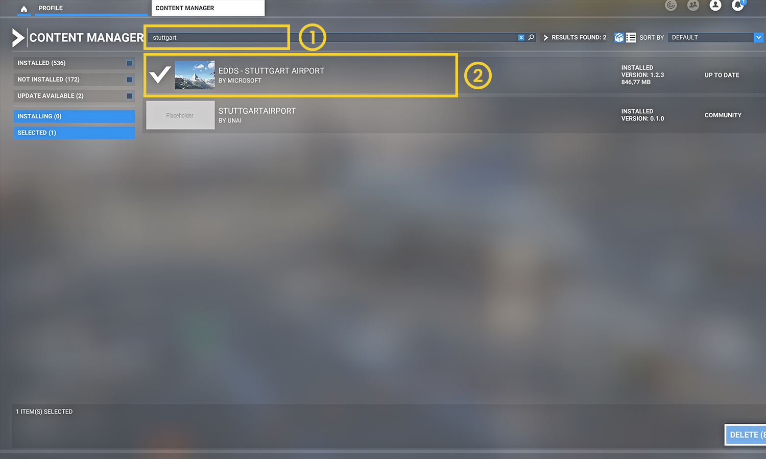 Enter the name or ICAO code of the airport in the search bar and select the result which you want to remove. Be sure to remove the default airport labeled Microsoft or Asobo and not the add-on airport you want to use!